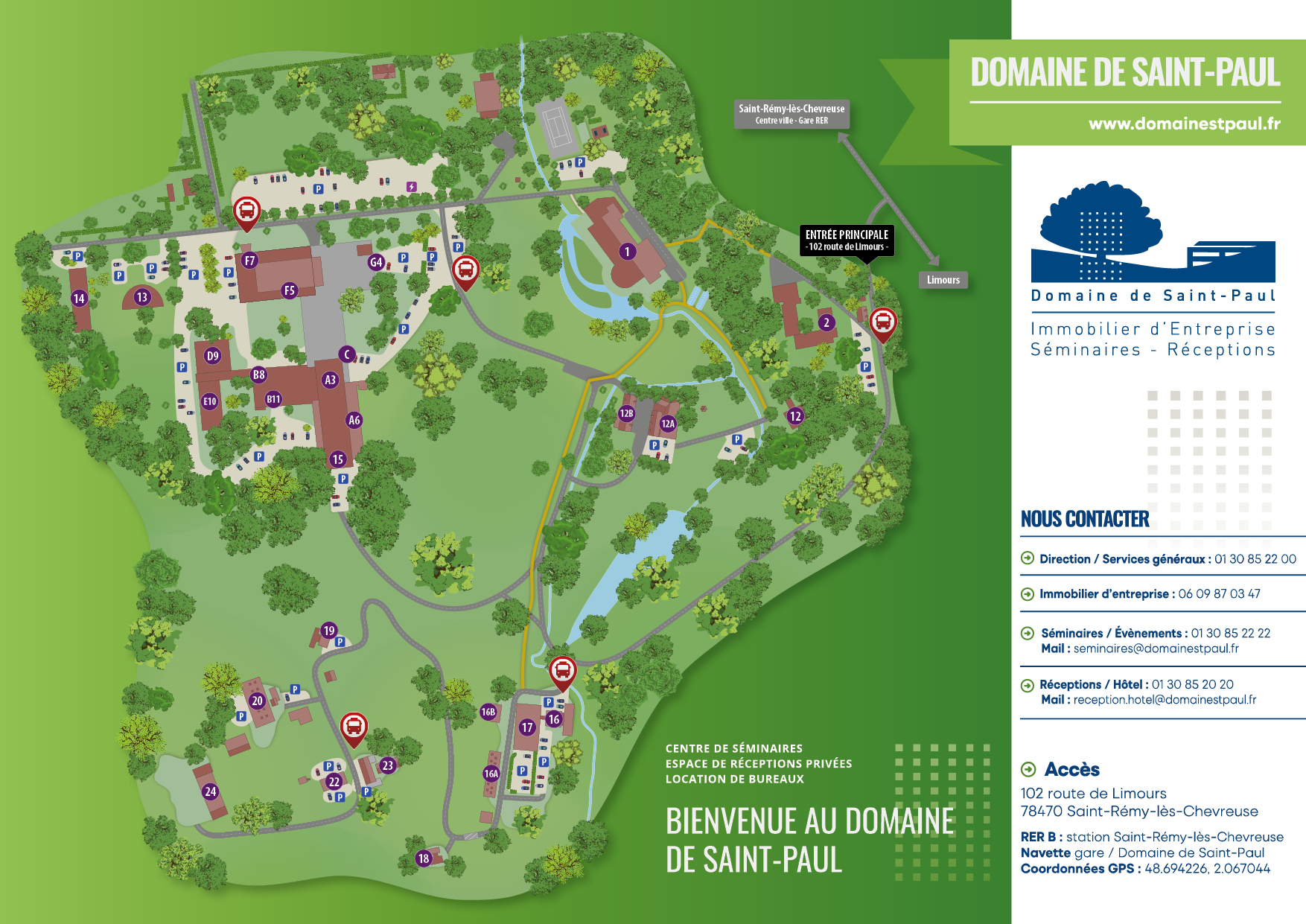 A multi-service business park nestled in the heart of the Chevreuse Valley (Yvelines), the Domaine de Saint-Paul offers a seminar center with modular meeting rooms, auditoriums, restaurants, and a hotel. The venue is located approximately 1-1.5 hours by car or train, from Paris.